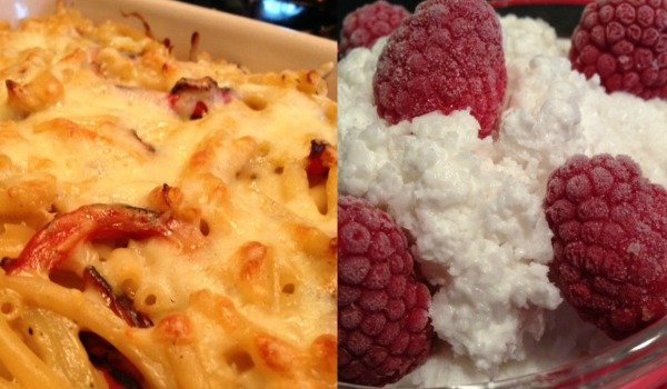 The final main meal used up a box of macaroni with cheese sauce (above left). Chargrilled red peppers, onions, milk and a sprinkle of extra cheddar were added to the basic mix to make a thrifty, filling meal, and there was enough left over for lunch the next day too with salad on the side.