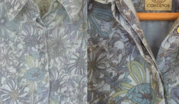 Finally, I decided to play around a little with colour theory for the last garment. DYLON Hand Dye in Ocean Blue is a beautiful, intense shade of blue with a tiny touch of red in it, and I watered it down by three quarters to create a more subtle dye wash that was a light cornflower blue. This allowed me to take a junk shop shirt with a white background and tint it to a softer, more flattering pale blue. It’s a subtle change, but the pattern really ‘pops’ now and the new background shade looks so much better against my skin tone.