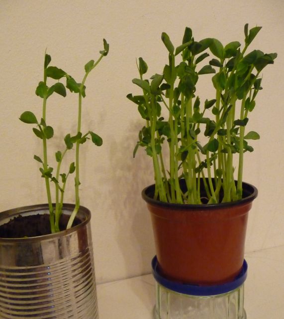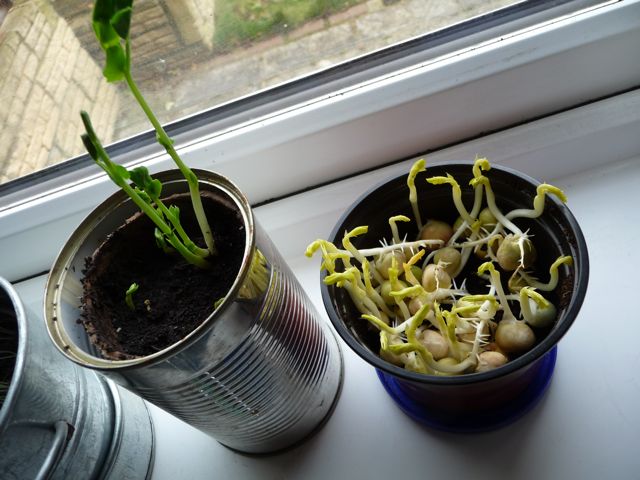 The best thing on the windowsill this week has been the pea shoots experiment. I planted one batch the traditional way two weeks ago – just stick the seed peas in a pot of compost, cover with at least 2cm more compost, water and then leave it all to sprout. Very easy, no messing about.