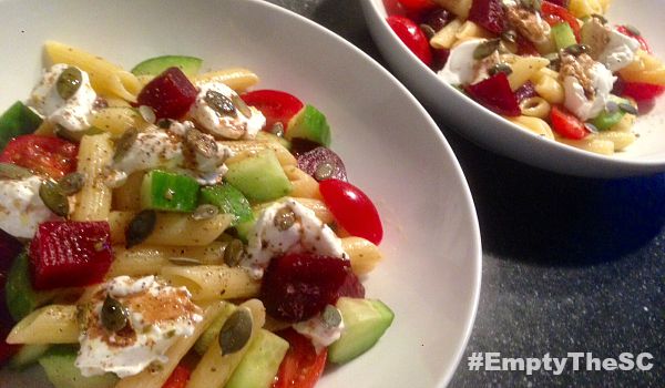 Finally, we made use of another 100g of dried penne pasta in the goat cheese and pasta salad (picture below). It also had half a pot of goat cheese, some beetroot, tomato, pumpkin seeds, olive oil, balsamic vinegar, mixed herbs and a home grown cucumber thrown in. Probably my favourite pasta salad so far.