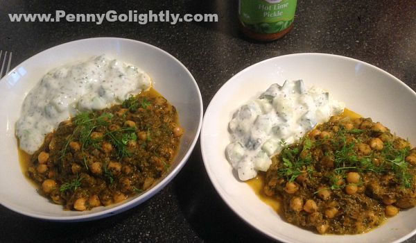 Our chick pea and spinach curry (above) tasted just right, and gave us the chance to finish the Kashmiri curry paste and the last of the coconut milk powder. It just needed a can of chickpeas, an onion, some frozen chopped spinach and fresh home grown coriander adding to make it into a decent dish. We also had some naan bread (on offer at the corner shop, four for £1), lime pickle and a quick home made cucumber raita on the side.