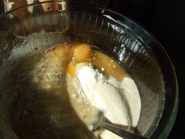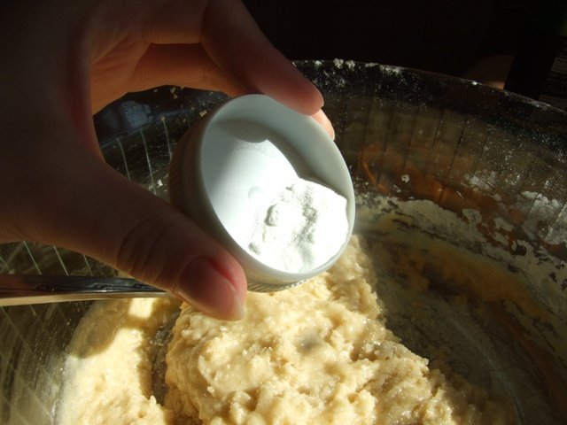 4. Add the baking powder and lemon juice (your cake will be so clean!). Stir it in slowly, so as not to slop.